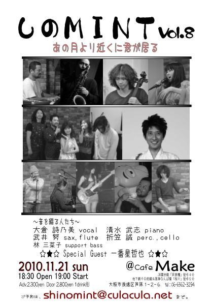 【しのMINT 8】 〜あの月より近くに君が居る〜 11月21日(日) @cafe make open18:30 start19:00 adv.2300yen door2800yen ※1drink別 メンバー 大倉詩乃美vo 清水武志p 武井努T&Ssax、Fl、chor 折笠誠perc、vc 林三菜子 support bass special guest 一番星哲也 8月後半にやっとこさメンバーのスケジュール調整ができたこのLIVE。 8月後半から12月前半まででメンバーの予定があったのが11月21日のみ! ひゃ〜〜〜〜〜www そのうえ、日程が決まった矢先にし