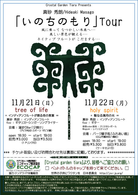 …素晴らしい世界観なので、是非ご覧ください♪ Crystal garden tiara Presents http://crystal-g-tiara.shop-pro.jp/ 真砂 秀朗 / Hideaki Masago 「 いのちのもり 」Tour 風に乗ってなつかしい未来へ… 美しい景色が観える… ネイティブフルートがこだまする… ○2010年11月21日(日)○ 〜 tree of life 〜 =インディアンフルートが語るいのちの言葉=