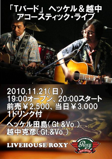2010.11.21(日)「Tバード」ヘッケル&越中 アコースティック・ライブ 19:00オープン、20:00スタート 前売¥2,500、当日¥3,000 1ドリンク付 ヘッケル田島(Gt.&Vo.) 越中克彦(Gt.&Vo.)