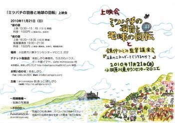 今週日曜日にイベントを開催しますのでこの場を借りて告知させて頂きます。 興味がありましたら是非お越し下さいませ。 -----------以下告知---------- 〜これは、原発建設に反対する祝島の人々と、 スウェーデンの自然エネルギーについての映画です。〜 『ミツバチの羽音と地球の回転』上映会 +鎌仲ひとみ監督講演会(「未来のエネルギーをどうするのか?」) 【日時】2010年11月21日(日) (昼の部) 上映 13:30〜15:45(13:15 開場) (夜の部) 上映 16:20〜18:35(16:00 開場)