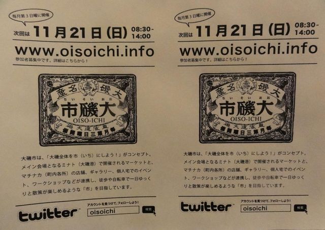 二宮町の隣の大磯町で9月からはじまった大磯市、 その第三回が11月21日に行われます。 http://www.oisoichi.info/ 市の開催時間は、 朝9時(早朝から営業する一部店舗を除く)から14時ごろまで。 今回、メイン会場のミナト(大磯港)には、 地元大磯を中心に、西湘・湘南エリアから 40〜50軒の物販&飲食ショップが集まる予定です。 *出店のお申し込みは、まだまだ下記ページにて受付中! http://ow.ly/37hLT 当日は、すぐ隣の県営駐車場内で 「大磯ふれあい農水産まつり」も開催されるため、 ミナト周辺は、相当な人出になること