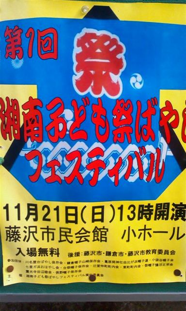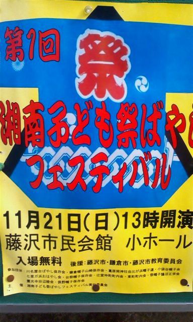 □第1回湘南子ども祭りばやしフェスティバル□ 日時:2010年11月21日(開演13:00) 於:藤沢市民会館小ホール 湘南各地域の祭囃子保存会等の子ども(小・中・高校生)を中心としたフェスティバルです。 北鎌倉地区からは小袋谷 山崎 台の三団体が出演致します。 入場無料! よろしくればお越し願います。