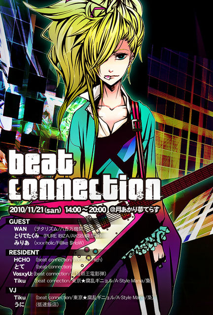 「待たせたな!」 1st stageから早4ヶ月…待望の2nd stage開催決定!!! 大盛況のうちに終わった前回を更に越える豪華なゲスト陣!!! 11/20に想いを込めて…!!音ゲー祭りついに開催!!! DJが次々と繋いでいく音ゲー曲の筐体を超えてのコラボレーション! しかも!ゲームではなかなか味わえない爆音があなたを包み込みます…! 音ゲー大好きなあなたも!!クラブ大好きなあなたも!! ま、なにはともあれビーコネってことで!!!! □■□beat connection -2nd stage-□■□ ------21,November------ 【イベン