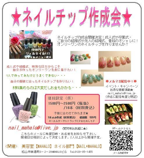 ネイルチップ作っちゃいましょう! とりあえず、1回やってみないと わからないことばかりなので、みなさんの意見を いただきながら改良していきたいと思います! (とりあえずなので、時間指定ごめんない><) ひとまず2,3人とかでやってみたいと思います! 持ち物は ・チップを並べられる空箱(お菓子やティッシュなど) ・もし、自分のお持ちのものでチップの飾りにしたいもの ・つくりたいデザインの写真など(当店雑誌で選択可) ですかね。 ご予算明記の上、参加希望をお願いします♪