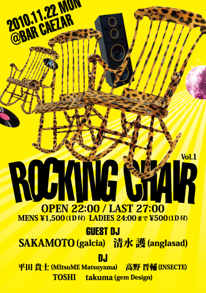 - ROCKING CHAIR vol.1 - 2010.11.22(MON) @Bar Caezar OPEN - LAST 22:00 - 27:00 TICKET DOOR MENS 1500yen w.1DRINK LADIES 24:00までに来場すると500yen w1DRINK GUEST DJ SAKAMOTO (galcia) 清水 護 (anglasad) 染谷 裕介 (LITAMUSCA) DJ's 平田 貴士 (MItsuME Matsuyama) 高野 晋輔 (INSECTE) TOSHI takuma (gem Design) info MItsuME Matsuyama 790-0003 愛媛県松山市三番町4丁目9-10 ISビル 2F TEL&FAX 089-993-8044 営業時間 12:00 - 20:00 (定休日・水曜日) HP : http://www.mitsume.net/ gem Desig