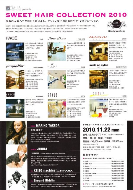 スペースをお借りしてイベントの紹介です! 【SWEET HAIR COLLECTION-2010】 広島の人気ヘアサロン9サロンによって構成されるSWEET HAIR COLLECTION 2008,2009と続き今年で3回目を迎えます。 2010のテーマは「女ゴコロ、キレイゴコロをカスタマイズ」をテーマに開催。 オシャレ好き、オシャレになりたい女の子のためのヘア・レボリューション 最新のヘアデザインを始め、トレンドアイテム、サブカルチャーなど盛り だくさんなコンテンツで広島の女性にお届け致します。 その中から生まれる絆、アイデアから新たな企画、ビジネス