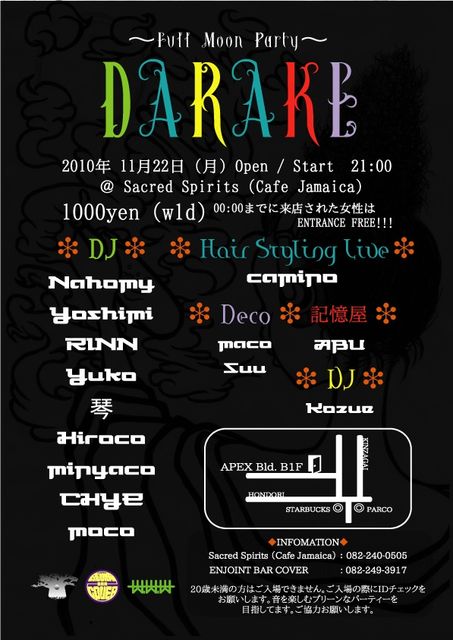 不定期でENJOINT BAR COVERにて開催されている女の子DJ陣によるモンスターパーティー『DARAKE』。 今回で第五回目という事もあり、Cafe Jamaicaにて開催決定!!!!! さらにこの日は満月!!!女子パワー見してもらいまひょう〜〜〜〜 『DARAKE』 〜〜Full Moon Party〜〜 2010年11月22日(月) Open/Start 21:00 @Sacred Spirits(Cafe Jamaica) Door 1000yen(w1D) 0:00までに来店された女性はENTRANCE FREE!!!!!!!! *DJ* Nahomy