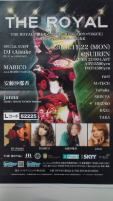 管理人さまイベント告知失礼致します。 2010.11.22(MON)@SUIREN "GIFT 5th presents The Royal" ADV:3500yen DOOR:4500yen Special Guest tAisuke(PLUG in LANGUAGE) MARICO(武田真理子) SAYAKA ANDO(安藤沙耶香) junna(5 SHIP / HOUSE NATION Dancers) cast M+TECH TaNaKa SHIN-YA HIROKO KXX1 TAKA SEXY DANCERS HARUKA NANA TACHI REINA ◆DJ tAisuke(PLUGinLANGUAGE)◆ 2000年初頭にDJキャリアをスタートし、東京を拠点に日本各地、そして海外での出演を経て、卓越したDJスキルをマス