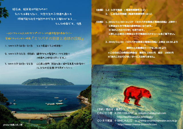 〜脱石油、脱原発は可能なのか? 私たちは事実を知り、何世代先の子供たちの為にも 持続可能な社会や自然の中で生きる権利がある、、、そんな映画です。〜信恵 長編ドキュメンタリー映画 『ミツバチの羽音と地球の回転』 <ヒバクシャ><六カ所村ラプソディー>の鎌仲監督の最新作 1 2010年11月20日〜27日 シネマ尾道にて上映決定!! 2 2010年11月22日(祭日前) 鎌仲ひとみ監督のトークも決定!!