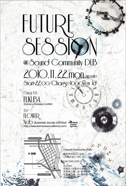 告知失礼します。 横浜は桜木町〜日ノ出町近郊・大岡川沿いの2階に位置するUnderground Dance Music最重要地点、横浜の歓楽街、そして日本屈指の音響を誇るMusic Bar「Sound Community DUB」にて開催しているパーティのお誘いです♪ 今回は「Gallery」、「Smoker」など東京を中心に活動しているDJのFUKUBA氏がゲストDJとして出演します。 この機会に是非!ジャンルの枠にに囚われることなくDance Musicで遊びましょう〜 【FUTURE SESSION】 @Sound Community DUB 2010.11.22(Mon・祝日前) 22:00 Start Charge:1000yen(1drink)