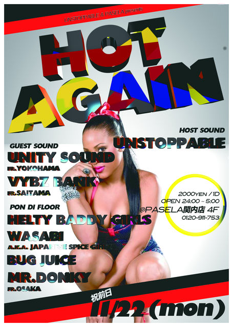 UNSTOPPABLE & PASELA PRESENTS!!!!! 11/22(月)祝前日 HOT AGAIN!!!!! @PASELA関内店4F ADM:2000yen 1d OPEN24:00-5:00 GUEST SOUND UNITY SOUND fr.YOKOHAMA VYBZ BANK fr.SAITAMA PON DI FLOOR HELTY BADDY GIRLS WASABI a.k.a JAPANESE SPICE GIRLZ BAG JUICE Mr.DONKEY fr.OSAKA HOST SOUND UNSTOPPABLE @PASELA関内店4F 〒231-0046 横浜市中区末広町3-95 0120-911-753 【アクセス】 JR関内駅北口を出て16号を 長者町方面へ徒歩3分