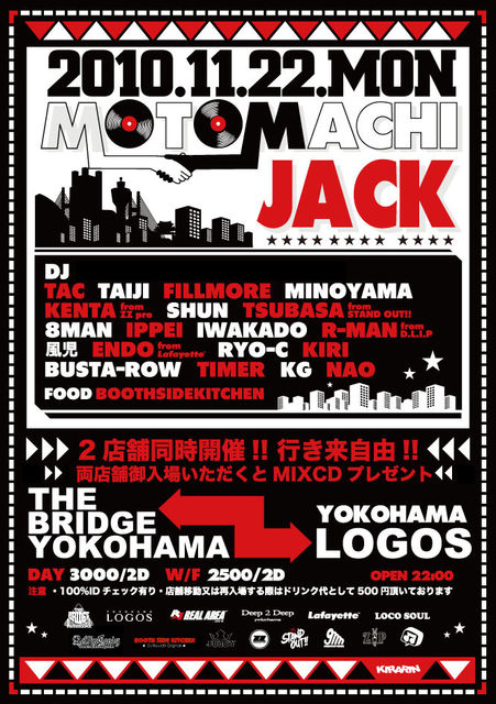 管理人様告知失礼致します。 横浜最大級のお祭り!!! 横浜・元町CLUB LOGOS・BRIDGEの全面サポートによる新たなPARTYが始まる。 『MOTOMACHI JACK』 携帯からはこちら↓ なんとCLUBを行き来自由!!のCLUB JUNCTION。 お客様の気分で移動可能!!(再入場・移動の際は別途ドリンク代がかかります) DJは横浜を代表するベテランから若手が、 HIP-HOP、R&B、WEST COAST、ミドル〜ダンクラまで様々な選曲で盛り上げてくれるでしょう。 FOOD・物販ブース有り!! 無料巡回シャトルバス運行!! そして、2