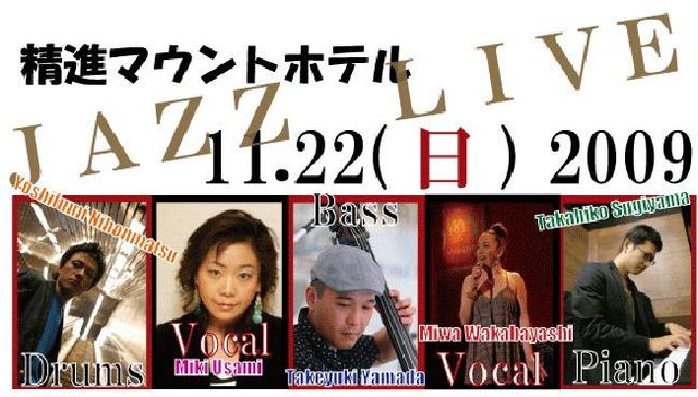 管理人様、告知失礼致します。 JAZZ LIVE 〜精進湖畔 精進マウントホテル〜 ■DAY: 2009.11.22(SUN) OPEN-19:00〜 START-20:00〜 ■CAST: ★若林みわ(Vo) ★宇佐美真紀(Vo) ★山田剛之(B) ★二本松義史(Dr) ★杉山貴彦(P) ■PLACE: 南都留郡富士河口湖町精進301 精進マウントホテル内会場 TEL 0555-87-2200 mail info@shojiko.com ■ENTRANCE FEE: 前売り 2,000円 当日 2,500円 ■MESSAGE: 若林さんと山田さんは山梨出身のアーティストです!! その二人を加え