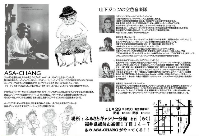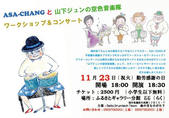 ASA-CHANG と 山下ジュンの空色音楽隊 ワークショップ&コンサート! 福井初!あのASA-CHANGさんが福井に タブラボンゴを引っさげてやってくる!! タブラボンゴナイトとしてお送りするASA-CHANGの音色に 酔いしれて、アフターライブにはあの劇団四季ミュージカル「ライオンキング」の 元パーカッショニスト 山下ジュンによるコンサート! なんとアフターライブにはASA-CHANGが参加するという情報も! こんな機会は二度とない?? 音楽の本質に迫る、魅惑の夜です。 お誘い合わせのうえ是非お越し下さいませ! 日時:11月23