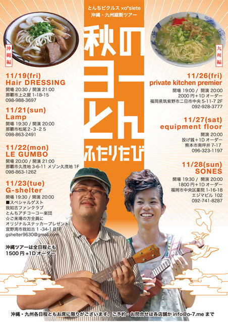 今月下旬に、福岡インディーズの雄、松浦浩司さんによるソロユニット「とんちピクルス」が来沖!! G-shelterでもライブをするのですが、私も対バンします〜!! ジャズ研連中とバンド組みました! いまんとこフリー&ファンクなバンド その名も「我如古ファンクラブ」!! 私はテキトーな事叫ばせてもらってます!! ‥がんばりま〜す!! ★とんちピクルス http://www.jasrac.or.jp/indies/fukuoka/tonchi_pickles/index.html ★o*siete http://o-7.me/ 【とんち×o*siete 沖縄・九州縦断ツアー】