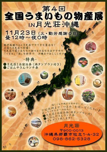 11月23日 全国うまいもの物産展 in沖縄 勤労感謝の日に月光荘ですてきな宴会を! 全国の月光荘の皆様! 月光荘の宴にあなたの街のまたあなたおすすめの 「つまみ」「お酒」を持参で 沖縄までおこしください! 悔しくも沖縄まではこれない方! そんな私たちにつまみを送って下さい! 送ってくれた方への御礼に ・沖縄ご宿泊券(満タンプラン付き) ・ごはんやさんランチ券 をプレゼント! SKYMARKのスカイバーゲンでは21日前の予約でも 神戸ー沖縄7800円、 福岡ー沖縄5800円、 羽田−沖縄 9800円前後のも