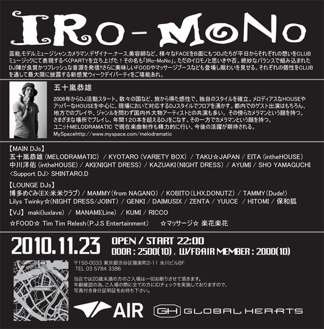 芸能,モデル,ミュージシャン,カメラマン,デザイナー,ナース,美容師など、様々なFACEをB面にもつDJたちが平日からそれぞれの想いをCLUBミュージックにて表現するべくPARTYを立ち上げた その名も「IRo-MoNo」。ただのイロモノと思いきや否。絶妙なバランスで組み込 まれたDJ陣が良質かつフレッシュな音源を発信 さらに美味しいFOODやマッサージブースなども登場し賑わいを見せる。それぞれ の個性をCLUBを通して最大限に披露する新感覚ウィークデイパーティをご堪能あ れ MAINはTECH HOUSE,HOUSE,PROGRESSIVE HOUSEあた