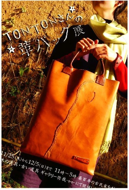 皆さん、こんにちは 【木の道具・古い道具 弥哉 -ゃゃ-】です 今年最後の展示会の案内です ━━━━━━━━━━━━━━━━━━━━━━━━━━━━━━━ ◆TONTONさんの革バッグ展◆ 11/25(木)〜12/5(日) 11〜17時(会期外時間外は御予約ください) 木づちでトントンたたいて穴を開け、 2本の針でチクチク編むように縫っていく・・・ TONTONさんの革バッグは全て手作り 自然の風合いを活かしてつくるため、ひとつとして同じものはありません 底の丸いバケツ型トートや たくさ