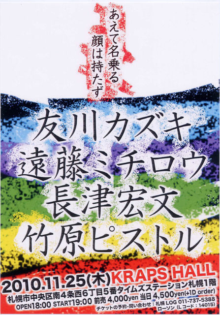 2010年11月25日(木)@札幌KRAPS HALL open:18:00 start:19:00〜 前売り¥4,000(当日¥4,500)+要1オーダー(¥500〜) 出演:友川カズキ 遠藤ミチロウ 長津宏文 竹原ピストル 場所:KRAPS HALL 札幌市中央区南4西6タイムスステーションビル札幌1F TEL:011-518-5522 チケット:札幌LOG、ローソン(Lコード:14015)