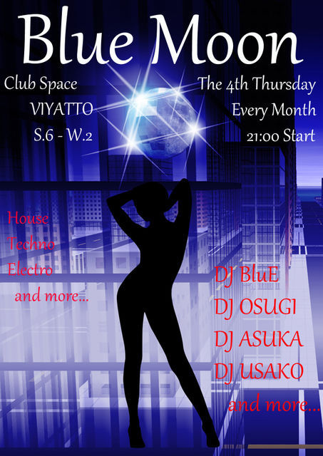 毎月第4木曜のNew StyleなHouse & Techno & Electro 『Blue Moon』 <イベントコンセプト> 目当ての誰かが居るからイベントに来た。 最初の挨拶はその人だけに挨拶した。 イベントも楽しみ、帰る頃には沢山の笑顔に「またここで逢いましょう!!」と言えた。 そんな楽しいイベントを目指して立ち上げる事にしました。 2010.11.25(木) 『Blue Moon』 2'nd Start : 21:00-27:00(Last) Entrance Fee : \1,500 (1D) 北海道札幌市中央区南6条西2丁目フォレストビルB1F VIYATTO Resident DJ : DJ BluE Regular DJ : DJ O