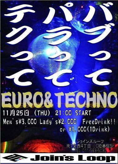 告知で〜す 【EUROBEAT&TECHNO PARTY】 ☆バブって! ☆パラって!! ☆テクって!!! お陰さまで3回目の開催となりました\(^^)/ 今でも扇子が舞い、 世代を越えて狂喜乱舞 しまくりなParty♪ 80's〜3次ユーロ、ジュリアナを 中心とした アゲアゲDISCO ですよ 可能な限りリクエストもガシガシお応えします 11月25日(木)21:00〜 男性3000 女性2000 ラストまで飲み放題 or 1000(1ドリンク付) 南7西5 LC拾番館5F Join's Loop DJ's YUJ