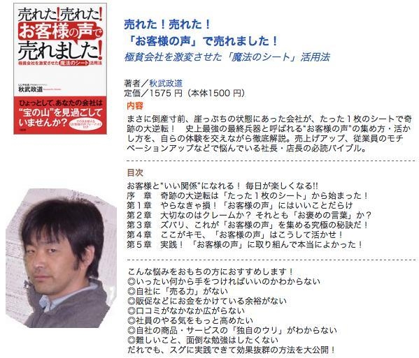 イーンスパイアの横田です。 なんと念願の尊敬する秋武政道さんが 新潟に初上陸します。 3年前に発売された秋武さんの著書である 売れた!売れた!「お客様の声」で売れました! 極貧会社を激変させた「魔法のシート」活用法 http://amazon.jp/dp/4804716858 を読んで、衝撃を受けました。 独立したばかりの私は恥ずかしい話ですが マーケティングを全く知りませんでした。 今回、共催の新潟ビジネスアカデミー主宰の 加藤昌樹さんの元でマーケティングを勉強したんです。 その加藤昌樹さんは秋武さんの愛弟子なん