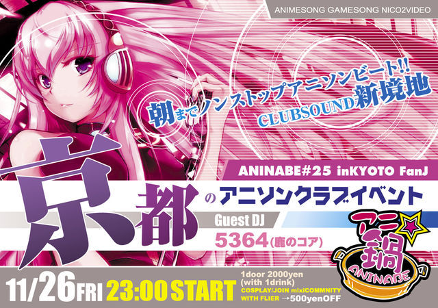 毎月最後の金曜日!!11月26日(金夜)は・・・ ■ANINABE - アニ鍋 style25 - 2010もあと2ヶ月、秋は一体いずこへやら((( ´ω`))) あっという間に寒くなってくるこんな季節、今こそみんなで盛り上がって暖まるしか無いじゃない!! アニ鍋は今月も豪華ゲストDJを迎え、勢いそのままに突き進んでいきます☆ ★OPEN/START★( ´ω`)∩<何時から? 23:00 OPENです☆ ★ACCESS★( ´ω` )∩<場所はドコ? 京都FanJ(http://kyoto-fanj.