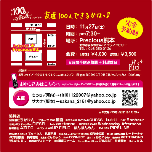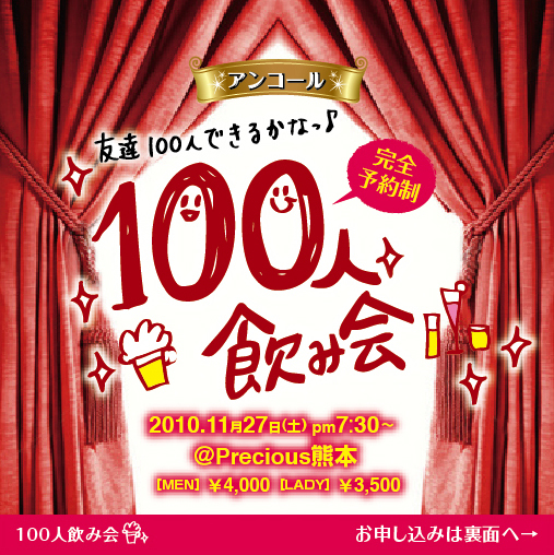 どうもこんにちは、縁会管理人のサカナです 先日の“100飲み会”に参加してくれた皆様、ありがとうございました おかげ様で、過去最高の大好評っぷりで、 なかなか終わっても会場からみなさん出られなかったり 今日がみんな初対面なんです☆というグループがいたり、 帰り道、手をつないでこっそり帰る男女をみかけたり・・・ それから数日間、“楽しかったー!”“100人飲み会で友達が出来た”等のメールがたくさん来ました♪ 年齢層も幅広い100人、いろんな出会いがあって、みんな楽しんでくれたならばそれがなに