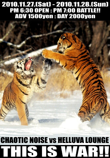 ★今週末11月27、28日は12月の爆裂周年月間のオープニングイベンツ!! "CHAOTIC NOISE"オープン以来、多大なる(悪)影響を与え続ける神戸の憎っくき、そしてイカシてイカレたライブハウス"HELLUVA LOUNGE"とのバトル!! 当然キ●ガイ共が今年も一斉に襲撃かけて来まっす!! ウギャー!! お互いの街、いやっ箱の意地とプライドを賭けた年に一度のポンコツ度2000%なガチンコバトルナイツを決して見逃すな!! そして、きっと訪れるであろう神戸からの刺客"プロの客"をもタダでは帰さへんでーーーー!! (↓)詳細はこちら ● 11月27日(土) [ CHAOTIC N