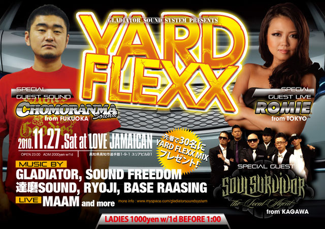 管理人様告知お願いします。 11/27(土)は、おなじみ高知REGGAEシーンを代表する人気イベントYARD FLEXX! 今回のゲストサウンドは、今年で結成15年を迎え、福岡を拠点に全国で活動を続ける、九州を代表するビックサウンド「CHOMORANMA」が2年振りの登場! ゲストライブは、待望のフルファーストアルバム発売を間近に控えるレペゼン高知フィメールシンガー「ROMIE」が登場! 当日先着30名様には、毎回好評YARD FLEXXオリジナルMIX CDをプレゼント! またGLADIATOR SOUNDから、11/20(土)全国発売となった絶賛発売中「
