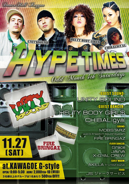 告知失礼致します。 11/27(sat) 『HYPE TIMES』 @川越G-style http://www.club-g-style.com/ 埼玉県川越市菅原町20-3 リンクスビル1F open 0:00〜5:30 adm \2000 / 1d (要ID) ●3名様以上のグループは1名あたり500円 OFF!! 【GUEST SOUND】 UNITY SOUND fr横浜 http://mixi.jp/view_community.pl?id=2569136 【GUEST DANCER】 HELTY BODY GIRLS fr東京 CHIBALIGYAL fr千葉 【HOST SOUND】 MOBSTARZ with Di Freedom Sound System http://mixi.jp/view_community.pl?id=4392383 FIRE B