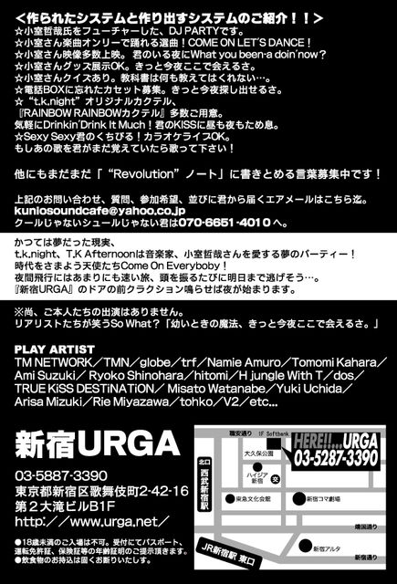 小室哲哉さん関連曲オンリーのひとときを週末の夜の新宿にて! 小室哲哉さん楽曲を愛するDJ&Liveパーティー、 “t.k.night”52回目のバースデー、オールナイト開催のお知らせです! 小室哲哉さんの音楽を徹底的に振り返り、 あらゆる角度から体感出来る充実のひとときをご一緒出来る空間を実現致します。 お一人の方、イベント初心者の方も大歓迎ですよ。 ご質問やリクエストも遠慮なくコメント、メッセージ下さいね! “t.k.night vol.15” 〜祝・小室哲哉さんバースデー!〜 日時:11/27(土)23:00〜All Night! 会場:新宿
