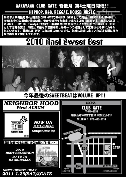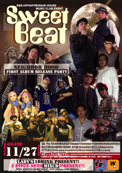 告知失礼します。 2010.11.27SAT SWEET BEAT@CLUB GATE OPEN:22:00 前売り1500 当日2000 IDチェックにご協力ください。 ※入場の際に写真付きの証明書が必要です。 ★★NEIGHBOR HOOD Release Party★★ ※当日NEIGHBORHOOH FIRST ALBUM物販開始!!! ★DJ YU-TA&DJAKIRAXXX "2010 BEST SELECTION" MIXCD PRESENT! http://mixi.jp/view_bbs.pl?id=57938567&comm_id=4901222 ★LADY'S 1ドリンクプレゼント! 出演 DJ:YU-TA/AKIRAXXX/Taketel/TSUKASA/YOSHIRO/DAI/KEISUKE LIVE:NEIGHBOR HOOD FLOOR&DANCE S