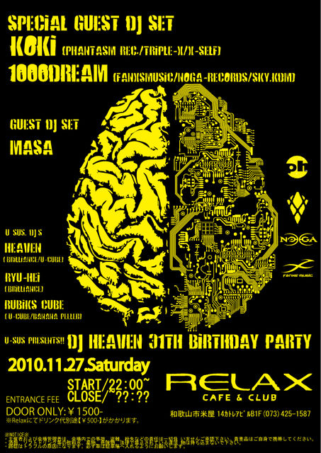 U-sus Presents!!DJ HEAVEN 31th Birthday Party 2010/11/27 (sat)@ Relax 和歌山市米屋町14 カトレアビルB1F 22:00〜start!! DOOR 1500yen +1Drink 500yen Special Guest DJ set ◆VA TRIPLE-X RELEASE DJ set◆ KOKI (Phantasm Rec./TRIPLE-X/X-SELF) 1000DREAM (fanxsmusic/NOGA-RECORDS/SKY.KDM) ■Guest DJ set NO13 (PsYeNcE CUBE) MASA ■U-sus. DJ's HEAVEN (U-sus./brilliance/U-cube) Ryu-Hei (U-sus./brilliance) ■DECO U-sus. ☆info 和歌山県和