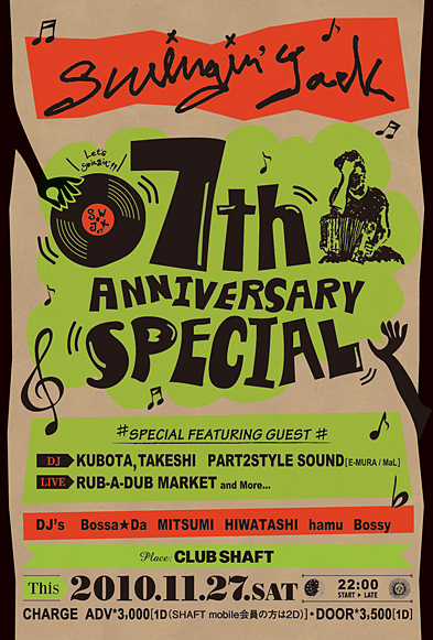 (*Swingin' Jack Twitterをフォローしている方、Swingin' Jack mixiコミュニティーに入っている方、CLUB SHAFTのモバイル会員になっている方は当日キャッシャーに提示して頂ければ、前売り料金で入場できます)