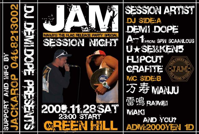横須賀ドブ板通り、GRREN HILLにて行われている2ヶ月に1回のHARD CORE HIPHOPの祭典、【JAM】vol.5がいよいよ本日11月28日(土)開催されます。 今年、地元横須賀を中心に日本各地で活動するアーティストが主となり始まった謎に満ちたPARTYは今回で5回目。これまでに、OJIBAH(from SD JUNKSTA)、大華(fromMSC)、シンゴ西成(fromLIBRA RECORD)、S.L.A.C.K等を招き、毎回満員御礼の横須賀発のBIG HIPHOP PARTY。 今回は...10月に1st ALBUM『THE FLAG』リリースしたばかりのJAMのRESIDENT MC!!万寿のリリースパーティー!! はたまた今回は奇才Shi