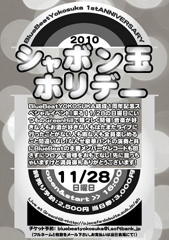 管理人様、告知失礼致します。 不適切だと判断された場合はお手数ですが削除願います。 BlueBeatYokosuka結成1周年記念スペシャルイベント! 来る11/28の日曜日にいつものGreen Hillで賑々しく開催! 音楽が好きな人もお酒が好きな人もはたまたライブに行ったことがない人も 暇な人も全員楽しめること間違いなし! なんせ豪華バンドの演奏と共にBlueBeatYokosukaの主要メンバーがレコードも回さずにフロアで 皆様をおもてなし! 皆様の御来場を心よりお待ちしています! ” Blue Beat Yokosuka 1st ANNIVERSARY “ シ