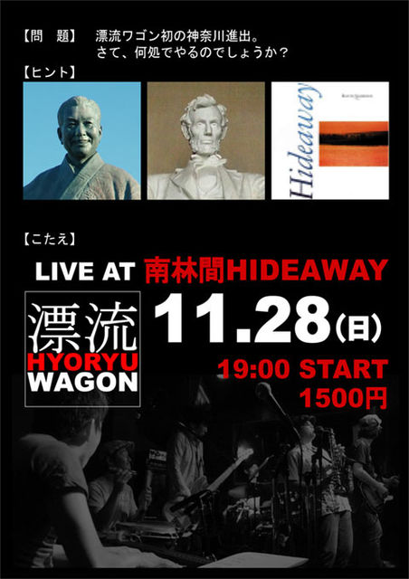 漂流ワゴン 初の神奈川進出! 小田急江ノ島線「南林間」駅前のライブハウス HIDEAWAY(ハイダウェイ)に出演します! 駅前西口ロータリーに面した建物の地下です。 気軽に足を運べるうえ、”ドラフトギネス”が飲めます! (ギネス強調はバンマスの個人的趣味です・・・笑) もちろん、着席でご覧いただけるお店です。 ただし、立って踊るのも大歓迎です! お楽しみに〜! ■11/28(日) [ACT] 漂流ワゴン [PLACE] 南林間 HIDEAWAY http://www.chez-ohya.net/hideaway/ [OPEN / START] 18:00 / 19:00 [CHARGE] 15