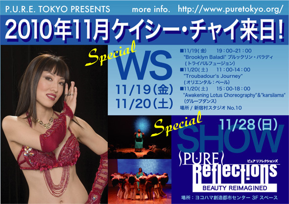 こんにちは NYから元ベリーダンス・スーパースターズ、現在BellyQueenとして世界的に活動する、ケイシー・チャイが緊急来日いたします! P.U.R.E.の創始者でもあるケイシーが、構想13年を経て2009年にNYで披露し大反響を呼んだ"リフレクション"を、 日米P.U.R.E.の合作で東京で再現。 NYから演出監督、共演者が来日し共同制作にて実現することになりました。 "リフレクション”に加え、ケイシー・チャイ、ラーレ・サヨコのソロ・パフォーマンスも同時開催予定です。 【Reflections Show】 「女性として生まれた喜び」を表現するベリーダン