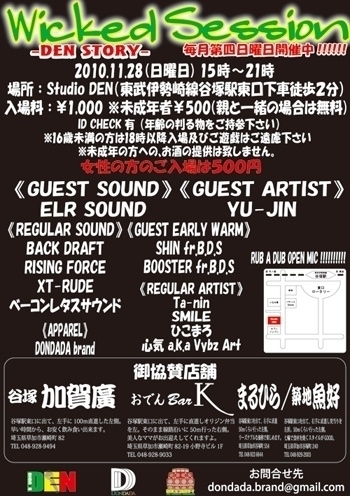 管理人サマ告知失礼致します。 Apparel Brand DONDADA Presents Wicked Session -DEN STORY- vol.11 2K10.11.28(日曜日) 15:00?21:00 @Studio DEN (東武伊勢崎線谷塚駅東口徒歩2分) Studio DEN地図 http://www.chizumaru.com/maplink.asp?SER=all&D=all&X=503295.373&Y=128919.362&SCL=2120 入場料 : 1000 女性 500 (未成年者 500 ※保護者同伴時は無料) ID check 有 (年齢の分かる物持参) 《大好評!8月からの新企画》 8月から来店されたお客様にスタンプカードを配布しています 来場回数にて豪華な特典がも