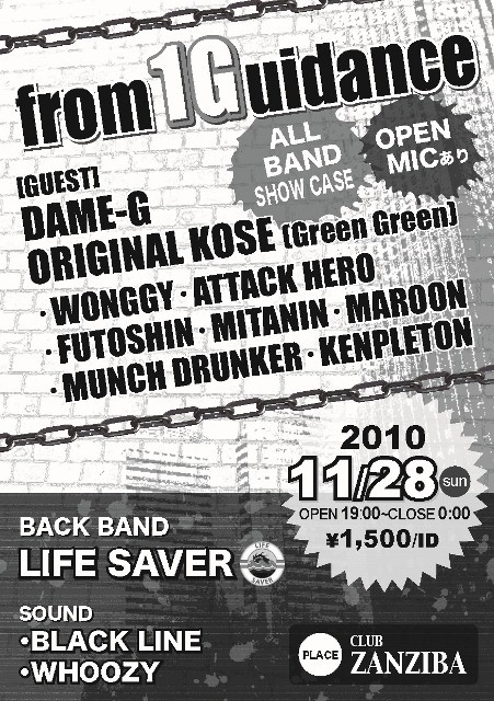 告知失礼します。 ***from1Guidance*** 2010年11/28(日) OPEN19:00〜CLOSE00:00 @ZANZIBA ¥1500/1D ☆GUEST SHOW CASE☆ ・DAME-G ・ORIGINAL KOSE(GREEN GREEN) ・WONGGY ・ATTACK HERO ・FUTOSHIN ・MITANIN ・MUNCH DRUNKER ・MAROON ・KENPLETON ☆☆☆BACK BAND☆☆☆ ・LIFE SAVER ★SELECTER★ ・BLACK LINE SOUND ・WHOOZY 簡単に言うと…、完全アーティスト主体のイベントでございます!! 強いて言うなら、SHOW CASEの時のオケはぜ〜〜んぶBANDで行います!!