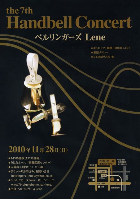 今年で18年目を迎えました。あっという間の時間の経過。 結成されたのがついこの間のような気がします。 隔年開催のLeneコンサートも第7回となりました。大好きなハンドベルで仲間と曲を作り上げる喜びを そして聴いてくださる皆様と音楽を共有できる機会を持てることに感謝しつつ、練習に励んでおります。 コンサートにぜひお越し下さいますようよろしくお願いいたします。 2010年11月28日(日)14:00開演(13:30開場) うはらホール(東灘区民センター) 入場料:1200円(4才以上) 申込み・問い合