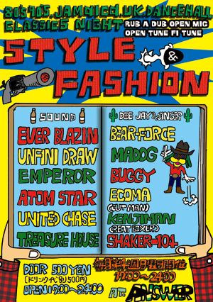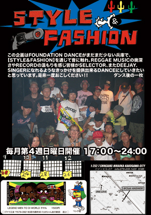 ■■$TYLE&FASHION■■ 毎月第四週日曜開催中!!80s,90s,JAMAICA&U.K DANCEHALL CLASSICS PARTY!!! ●2010.11/28(日)終電DANCE! ●OPEN17:00〜CLOSE24:00 ●前売り無しDOOR\500(別途要1Drink)@東加古川club ANSWER!! 今年のSTYLE&FASHIONも残すところ後二回!!兵庫でREGGAEの黄金時代「80s.90sを体感出来るDANCE」と銘打ち、メンバー全員でガムシャラに頑張ってまいりました!!この年代の曲は音の作りが非常に素晴らしく、今のREGGAEにはない良さがあります!!是非一度遊びに来て体感して下さい!!! 【SOUND】 EVER BLAZIN' UNFINY