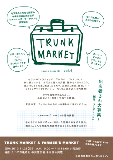 雑貨屋 itsumo 主催「TRUNK MARKET vol.4」開催決定! あなたの「イラナイ」が だれかの「シアワセ」に。 家に眠っている まだまだ着れる洋服。 聞かなくなったCD。 読んでしまった本。 雑貨。おもちゃ。文房具。楽器。食器。・・・ リュックサックやトランクに たくさん詰め込んで大集合! ちょっと洒落たフリーマケット。 見るもよし、物々交換もよし、売るもよし。 すごーく、たのしい1日になるはず。 出店数には限りがありますので、お早めに! 青空の下 たくさ