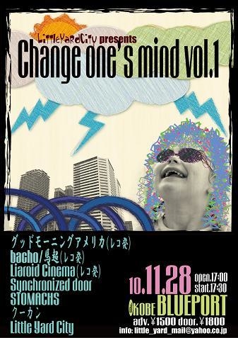 11/28(Sun) @KOBE BLUEPORT Little Yard City PRESENTS -Change one's mind vol.1- 音源を無料配布!! open 17:00/start 17:30 adv \1500/door \1800 ◆グッドモーニングアメリカ(レコ発) http://goodmorningamerica.jp/ ◆bacho/馬超(レコ発) http://www.bacho.jp/ ◆Liaroid Cinema(レコ発) http://liaroidcinema.com/ ◆Synchronized door http://synchronized-door.com/ ◆STOMACHS http://stomachs.jp/ ◆クーカン http://ip.tosp.co.jp/i.asp?I=kuukan7 ◆Little Yard City http://ip.tosp.co.jp/i.asp