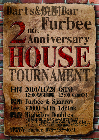 ★☆Furbee2周年記念ハウストーナメント☆★ 遂に『Dats&焼酎Bar Furbee』も2周年を迎えることができましたexclamation ×2 これも普段ご来店いただいてます皆様のおかげです ということで記念ハウストーナメントをやっちゃいます 開催日時 2010年11月28日 12:00受付開始、13:00〜Game On! 場所 Furbee&Sparrow エントリーフィー ¥2000(1ドリンク付き) 概要 High&Lowのダブルス。 チームの組み合わせはこちらで