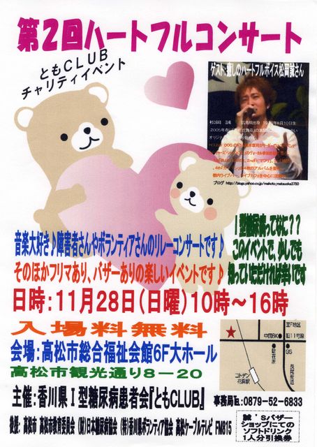 第2回『ともCLUB』ハートフルコンサート♪ 開催日時 2010年11月28日(日曜日) AM10時〜16時 開催場所 香川県(高松市総合福祉会館6F大ホール) *リレーコンサート出演者(バンド、ソロ、)セティングこみ20分 2人以下でのステージエントリー料 \2000 3人以上でのステージエントリー料 \3000 *フリーマーケット出店者 ブース料は無料(売上金の5%程度をご寄付頂ければ幸いです) *ボランティアスタッフ 大募集中です☆ 皆さんの出演負担金および、寄付金は?型糖尿病患者会『ともCLUB』やその他障害者団体さんへの活