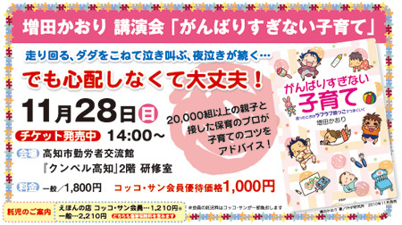 絵本のコッコサン主催で、下記のイベントをするそうです♪ 凄く良い講演会みたいなので、 興味ある方は、行ってみて下さい。 託児もあるみたいですよ〜♪ 私も行きたいところですが この日は予定があって行けないのです。(T_T) ------------------------------------------------------------ 増田かおり 講演会「がんばりすぎない子育て」 保育のプロが、子育てのコツをアドバイス! 走り回る、ダダをこねて泣き叫ぶ、夜泣きが続く... そんな我が子にお悩みのママも、心配しなくて大丈夫! 2万組以上の親