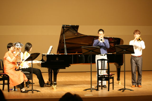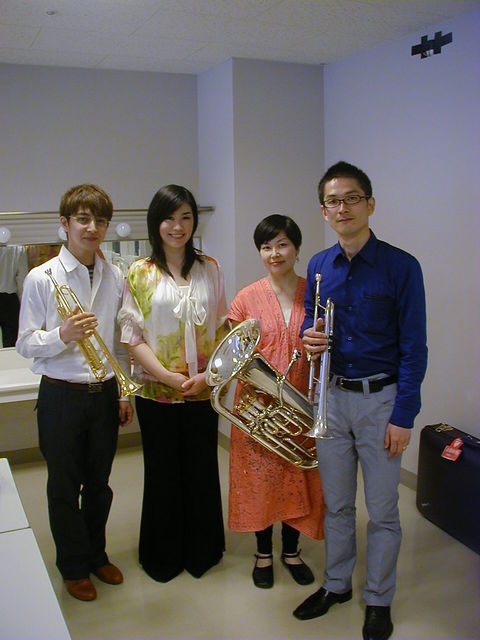 百福合奏団ともうします。トランペット二人、ユーフォニアム、ピアノによる四重奏です。他では聴けない編成、アレンジでお楽しみください!! 八代では4回目のコンサート。今回は『カーニバル』と題しまして二つのコンサートをお届けします♪ 11時からは親子コンサート!歌って手拍子してお客様参加型のコンサートです。 ワイワイ!ワッショイ!と楽しんでいただくコンサートですので、 お子さんの多少の泣き声なんて音楽の一部に感じてしまいますよ! おじいさん、おばあさんから赤ちゃんまで、ご家族総出で楽しんでいただきたいと思っております