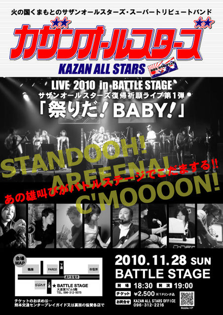 KAZAN ALL STARS バトルステージライブ2010 場所 : バトルステージ(熊本市上通り) 開場 : 18:30 開演 : 19:00 チケット:2,500円 今回は、カザン結成5周年となるライブ! 今回も茅ヶ崎からダンスチーム「KK MADNESS」が参戦決定! また、宮崎の日南からサポートパーカス「YOSHI」も参戦! 更に、5周年ライブに相応しい演出でサザンオールスターズの 復帰を祈願して盛り上がります! チケットのお求めは、熊本交通センタープレイガイドにて。 ※チラシは下記ページからダウンロードできます。
